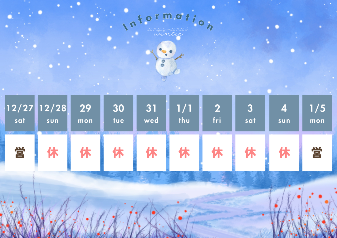 休業中にいただいたお問い合わせは2026/1/5以降に対応させていただきますので