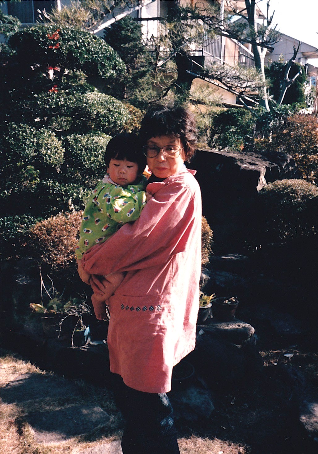 (庭の前で目を瞑るこの子は、果たして私なのか姉なのかは分かりませんが、服の柄が気になりますね👕)