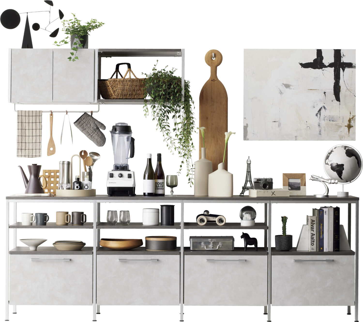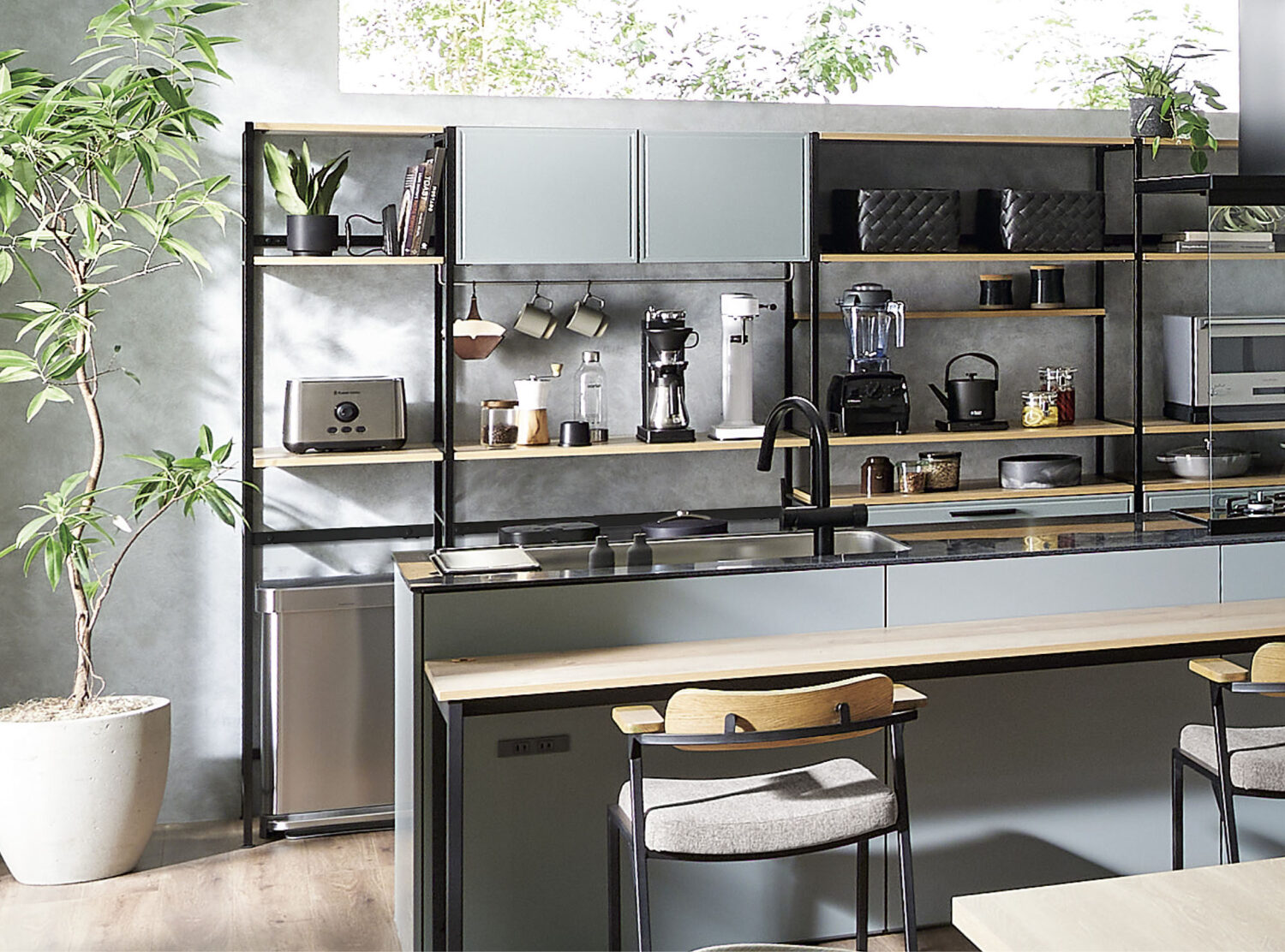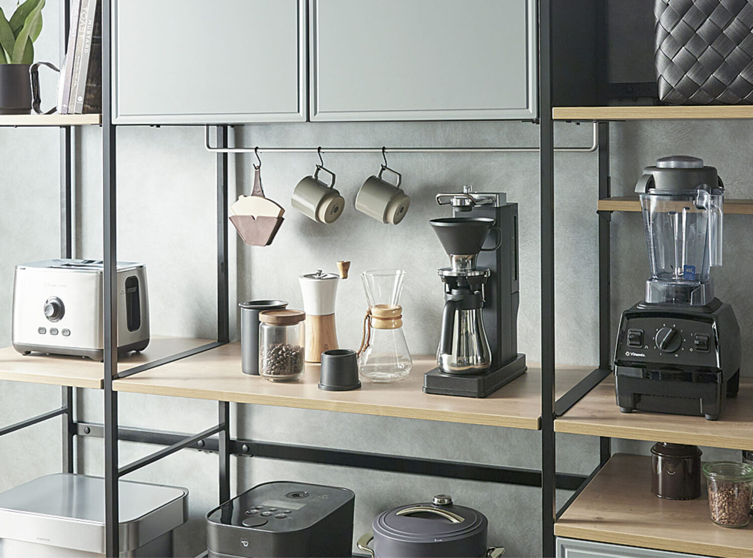 お気に入りの小物やこだわりのキッチン家電をディスプレイ感覚で収納できるので、キッチンまわりが美しく合理的に片付きます。