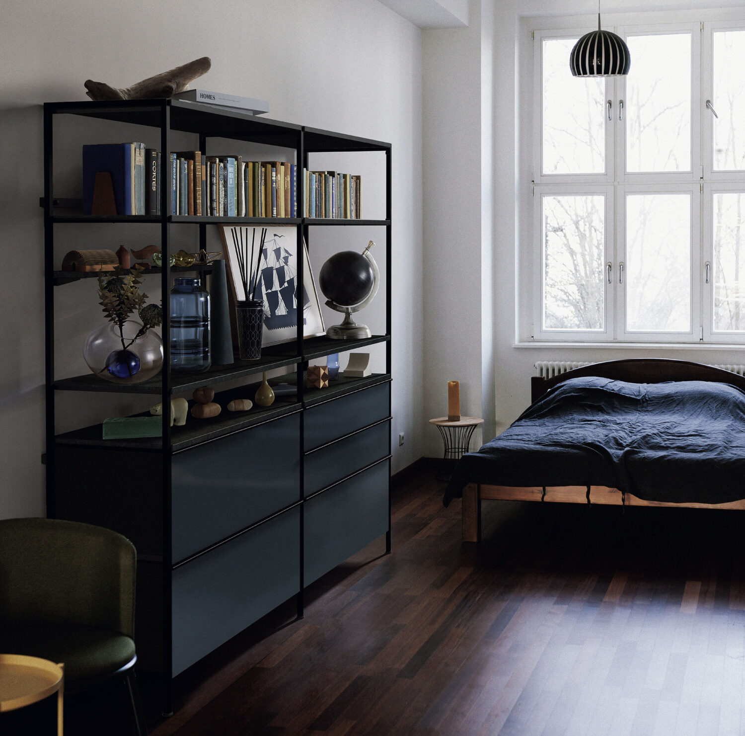 ここではマニアックな音楽人のためにスタイリング。それぞれのアイテムは「モノから音が聴こえてくるかどうか」を基準にセレクト。キッチン収納という役割に、ターンテーブルとレコードコレクションを配置したのがポイントですね。やっぱりいつでも音にこだわって欲しいので。木目柄とトレンドカラーのコンビネーションによって自由な気分を表現しました。