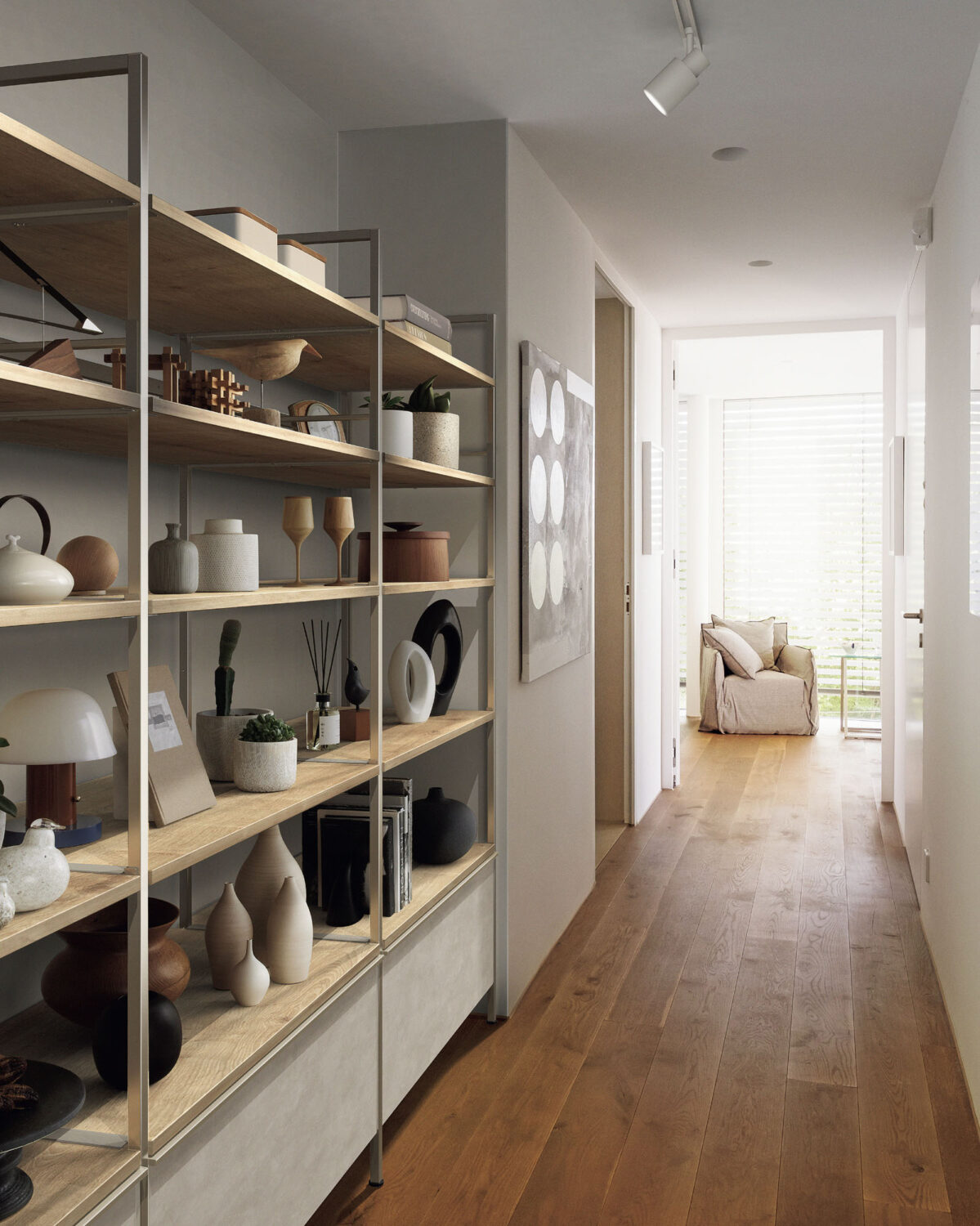 オープンな収納だから開放感があり、圧迫感を抑えます。また光を遮らないので、部屋が明るく爽やかな印象に。