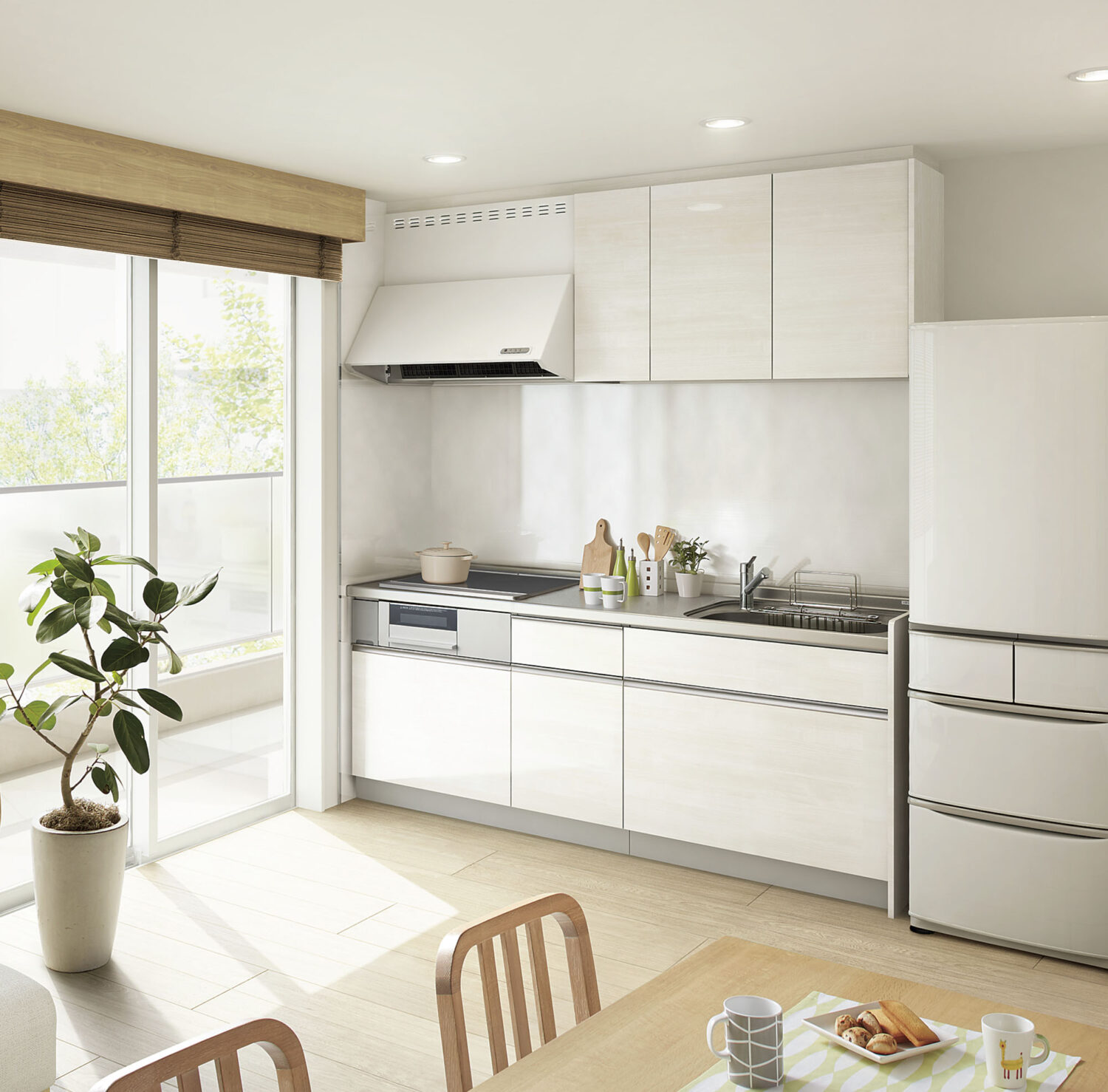 リビングと対面するペニンシュラタイプがすべての間口に対応応。開放感のあるフラットなワークトップでは、食事はもちろんキッチンを挟んでおしゃべりも楽しめます。