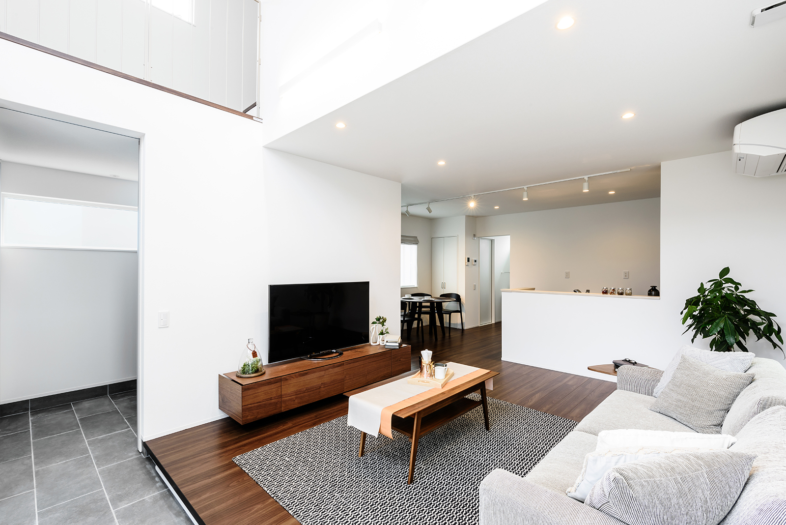 吹き抜けにより、1F にいながら 2F のフリースペースで過ごす家族の存在を常に感じられる開放的な住まい。家全体の風通しも良くなり、土間から 2F に直接行くこともできる利便性により、快適な住み心地を毎日実感できます。