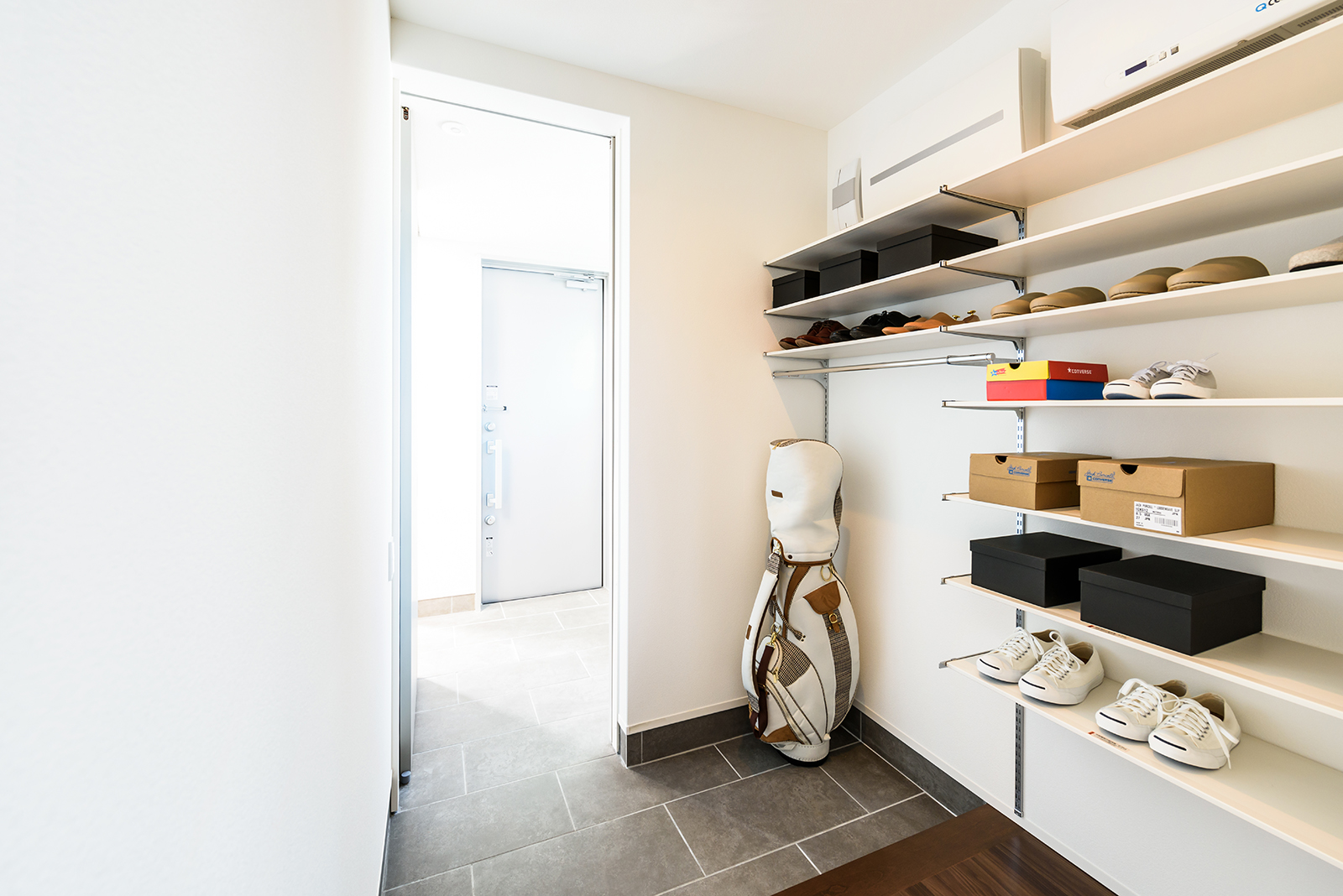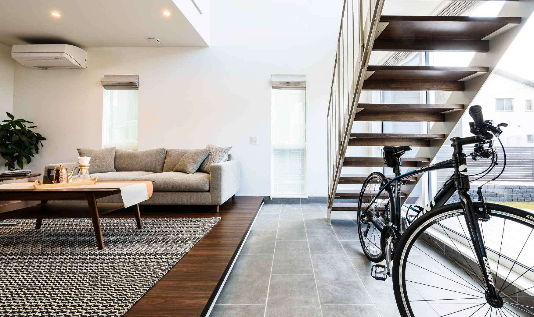 毎日使うお気に入りの自転車を乗り入れたり、くつろぎながら趣味の靴磨きに勤しんだり、観葉植物をたくさん置いて園芸を楽しんだりなど、土間の活用により屋外と屋内の関係性が強くなり、暮らしの楽しみ方が広がります。